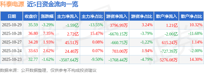 证券之星消息,截至2025年10月29日收盘,科泰电源(300153)报收于35.59元,下跌3.29%,换手率10.42%,成交量33.16万手,成交额11.72亿元。
