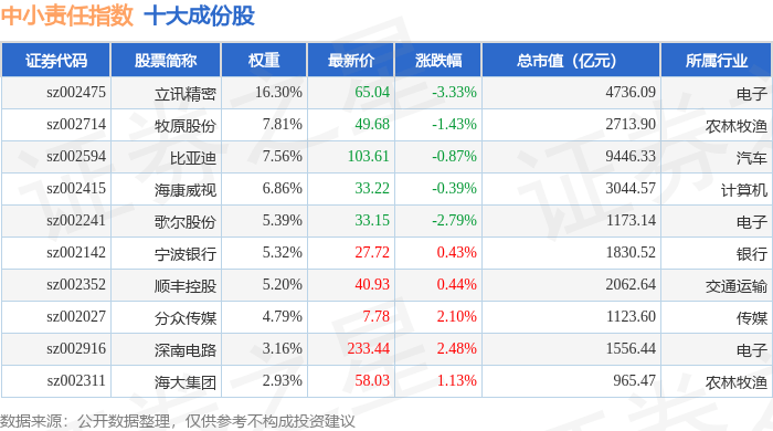 中小责任(399651)指数十大成份股详情如下: