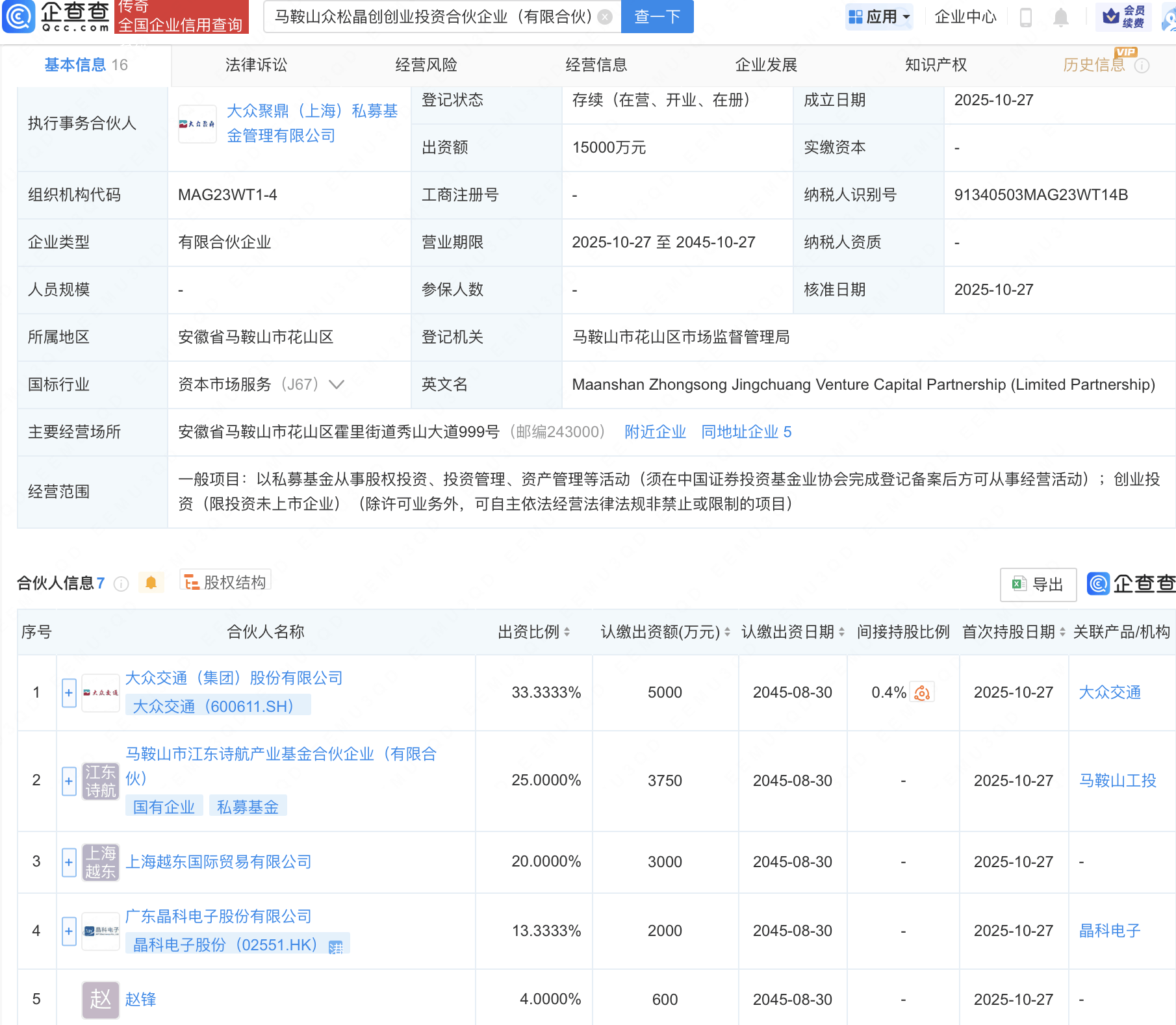 企查查APP显示,近日,马鞍山众松晶创创业投资合伙企业(有限合伙)成立,出资额1.5亿元,经营范围包含:以私募基金从事股权投资、投资管理、资产管理等活动。企查查股权穿透显示,该企业由大众交通(600611)、晶科电子股份(02551.HK)等共同出资。
