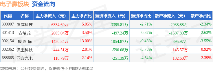 从资金流向上来看,当日电子鼻板块主力资金净流入1.04亿元,游资资金净流出5789.4万元,散户资金净流出4564.48万元。电子鼻板块个股资金流向见下表: