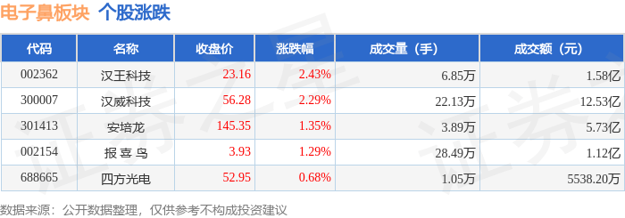 证券之星消息,10月31日电子鼻板块较上一交易日上涨1.76%,汉王科技领涨。当日上证指数报收于3954.79,下跌0.81%。深证成指报收于13378.21,下跌1.14%。电子鼻板块个股涨跌见下表: