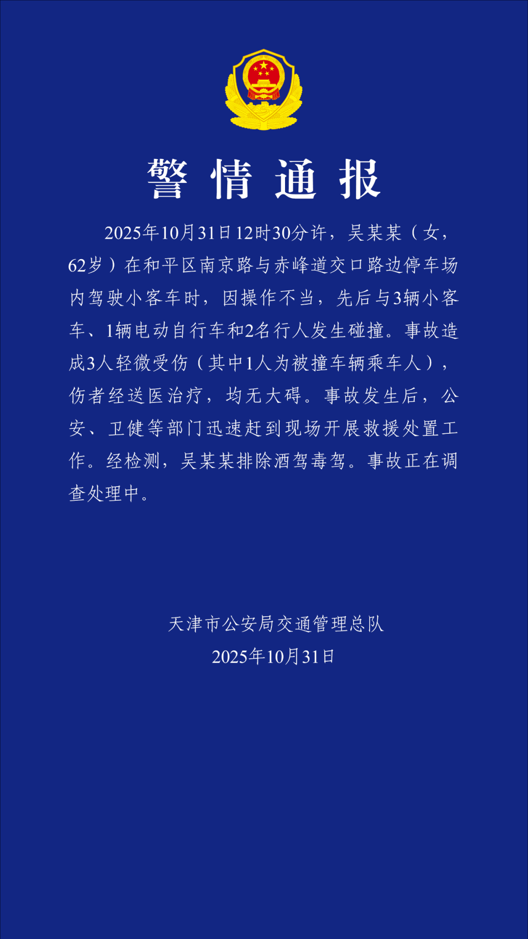 新京报讯 10月31日,天津市公安局交通管理总队发布警情通报: