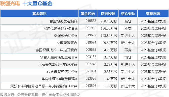 持有联创光电最多的基金为富国均衡优选混合,目前规模为35.12亿元,最新净值1.258(10月31日),较上一交易日下跌1.8%,近一年上涨56.43%。该基金现任基金经理为杨栋。