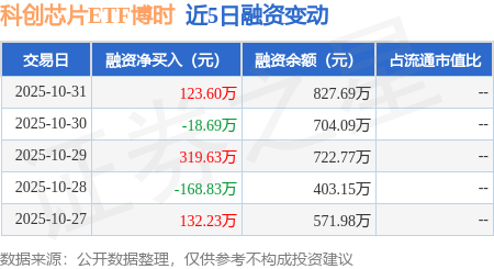 证券之星消息,10月31日,科创芯片ETF博时(588990)融资买入418.95万元,融资偿还295.35万元,融资净买入123.6万元,融资余额827.69万元。