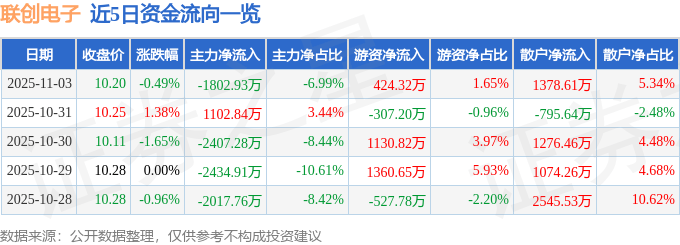 证券之星消息,截至2025年11月3日收盘,联创电子(002036)报收于10.2元,下跌0.49%,换手率2.42%,成交量25.5万手,成交额2.58亿元。