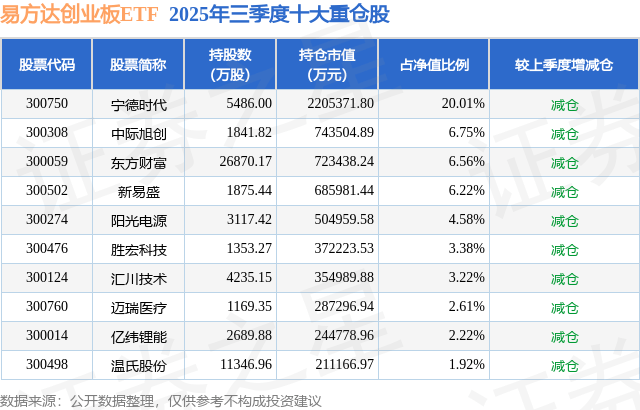 易方达创业板ETF的前十大重仓股如下:
