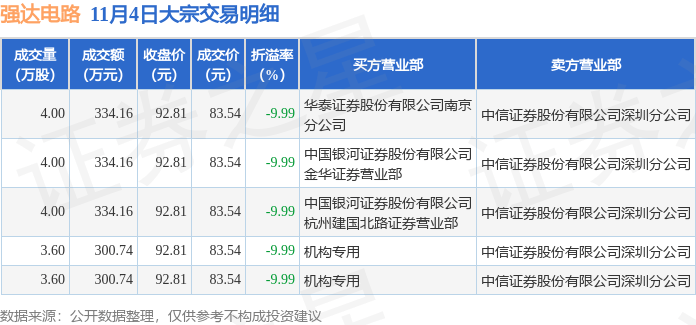 证券之星消息,11月4日强达电路发生大宗交易,交易数据如下: