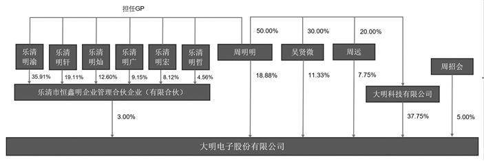 周明明、吴贤微和周远合计直接持有大明电子37.75%的股份,三人通过大明科技间接控制大明电子37.75%的股份;此外,周明明通过恒鑫明间接控制大明电子3.00%股份;一致行动人周招会直接持有大明电子5.00%股份。因此,公司实际控制人及其一致行动人合计控制大明电子83.50%股份。