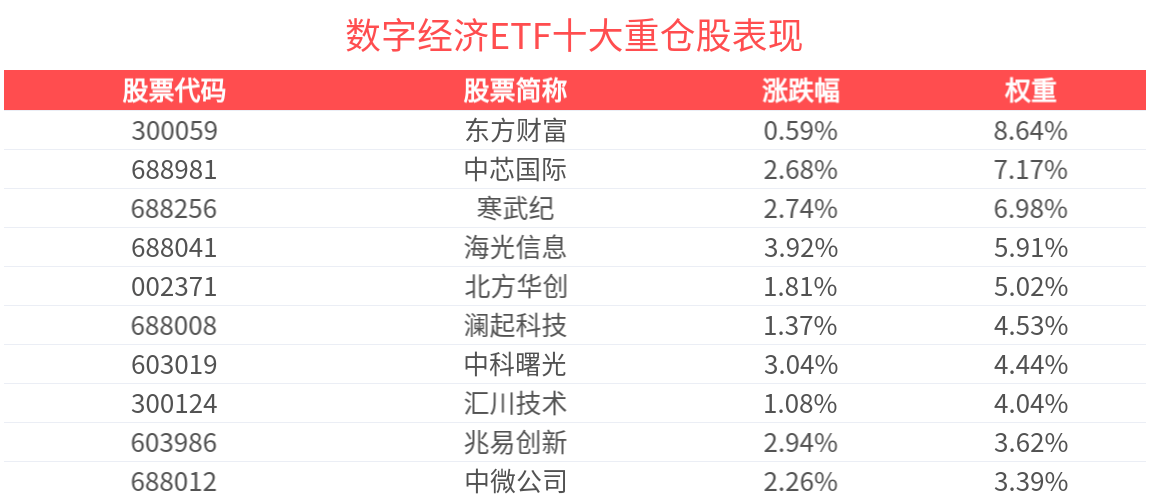 据Wind数据显示,截至2025年10月31日,中证数字经济主题指数(931582)前十大权重股分别为东方财富(300059)、寒武纪(688256)、中芯国际(688981)、海光信息(688041)、北方华创(002371)、澜起科技(688008)、中科曙光(603019)、兆易创新(603986)、汇川技术(300124)、科大讯飞(002230),前十大权重股合计占比53.93%。