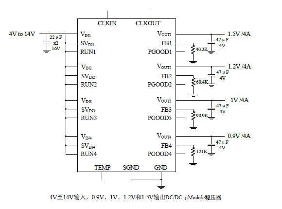 国产四通道4A DC/DC稳压器每路输出可提供4A电流,输出可通过并联形成一个阵列以提供高达16A的电流能力,封装中内置了开关控制器、功率FET、电感器和支持组件。