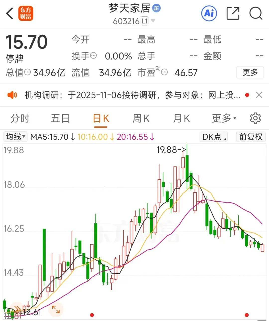 截至停牌前日(11月5日),梦天家居股价为15.7元/股,总市值约34.96亿元。