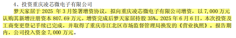根据梦天家居2025年中报,公司曾于2025年3月签署增资协议,拟向重庆凌芯微电子有限公司增资,以7000万元认购其新增注册资本807.69万元。2025年6月6日,本次投资及工商变更登记手续完成,梦天家居持股比例为34.9999%,成为重庆凌芯微的第二大股东。