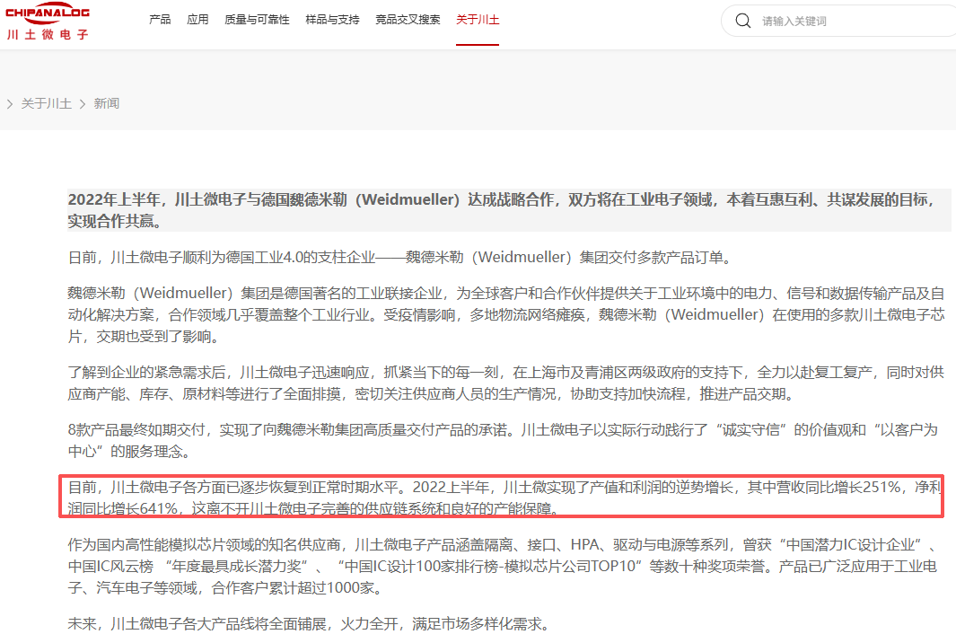 尽管川土微并未披露业绩,但据其官网此前披露的信息,2022上半年,公司曾实现产值和利润的逆势增长,其中营收同比增长251%,净利润同比增长641%。