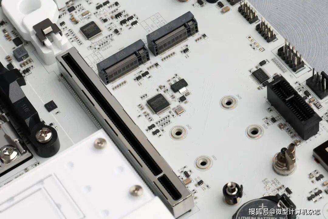 借助AMD锐龙9000系列处理器集成的24条PCIe 5.0通道,以及B850芯片组的采用,B850M ARK方舟主板有不错的扩展能力。该主板的3个M.2 SSD插槽中,其中2个采用PCIe 5.0 x4规格设计,由处理器提供传输带宽,可以完美支持那些传输速度在14500MB/s以上的满血版PCIe 5.0 SSD,让用户获得极致的存储性能。同时3个M.2 SSD插槽都拥有便捷卡扣设计,无须螺丝,用户只要旋转卡扣就能固定或拆下SSD,非常方便。考虑到SSD发热量大,所以这款主板还为3个SSD接口均配备了大面积一体式M.2 SSD散热装甲,而且M.2 SSD散热装甲还采用快易拆设计,用户只需扳动旋钮即可取下或安装散热装甲,非常方便。M.2 SSD散热装甲的另一面铺设了高导热硅胶片,让MOSFET、M.2 SSD的主控、闪存等高发热元器件能与散热片紧密接触,将热量快速地传导到散热器上,由机箱内部的散热气流高效带走。