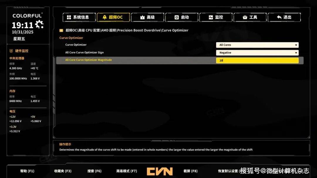 同时我们也测试了B850M ARK方舟主板的处理器超频能力,我们将重点测试主板的降压超频能力。借助丰富的BIOS设置,使用B850M ARK方舟主板对锐龙9 9950X进行降压超频很简单。用户只需要将CPU Boost Clock Override(CPU频率加成)设置为“Positive”(升频),再将下面的数值填写为200,也就是在PBO的基础上再增加200MHz频率。再在Curve Optimizer项目中修改为All Cores,展开的选项All Cores Curve Optimizer Sign修改为Negative,也就是对CPU工作电压进行降压。然后在All Cores Curve Optimizer Magnitude中填写20的降压幅度,就可保证锐龙9 9950X既能以更高的频率工作,又不会显著提升处理器温度。完成该测试后,我们也会简单测试B850M ARK方舟主板是否具备外频超频能力,以及其对内存的超频能力是否真的能达成DDR5 8400。