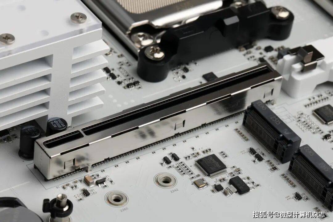 ▲主板最多支持192GB内存,内存插槽配备了金属加固层,标称最高内存支持速率为DDR5 8400。