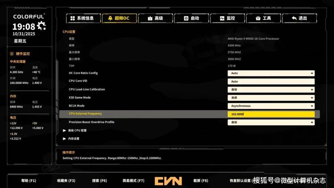 除了优秀的内存超频能力,此次七彩虹还为B850M ARK方舟主板加上了一颗独立时钟发生器,支持主板对AMD处理器的外频频率进行调节,这也就意味着用户可以在不改变处理器倍频的情况下对处理器超频,为超频玩家带来更多的玩法。同时在B850M ARK方舟主板BIOS中也会出现一个“CPU External Frequency”(处理器外部频率)的调节项目,用户可以在100MHz~110MHz的范围内进行超频尝试。为避免PCIe总线频率被同步超频,造成显卡、SSD不能稳定工作,“CPU External Frequency”项目的上方还有一个BCLK Mode(外频工作模式)的调节项目,进行外频超频时用户应将其设置为“Asynchronous”(异步超频)。