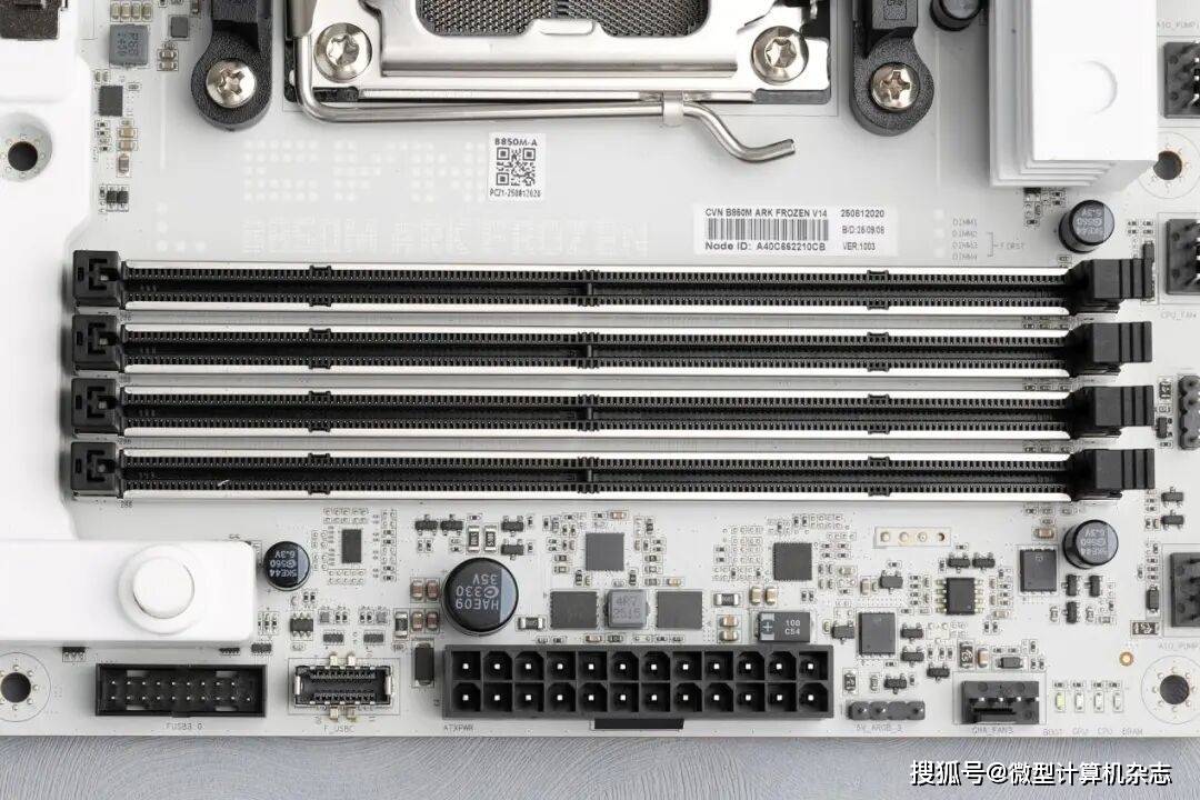 为了让主板有更好的超频能力,特别是对高频内存的支持能力,这款主板在硬件设计上采用8层服务器级PCB电路板,并针对内存超频优化了布线设计。同时主板上的4根内存插槽全部采用金属加固,这是以往只有在高端主板上才能看到的设计,可以防止内存插槽、内存PCB弯曲,提高内存插槽的可插拔次数。得益于优秀的做工用料,B850M ARK方舟主板标称最高可支持速率为DDR5 8400的内存,最大支持192GB内存容量,单根内存插槽最高可支持48GB容量。