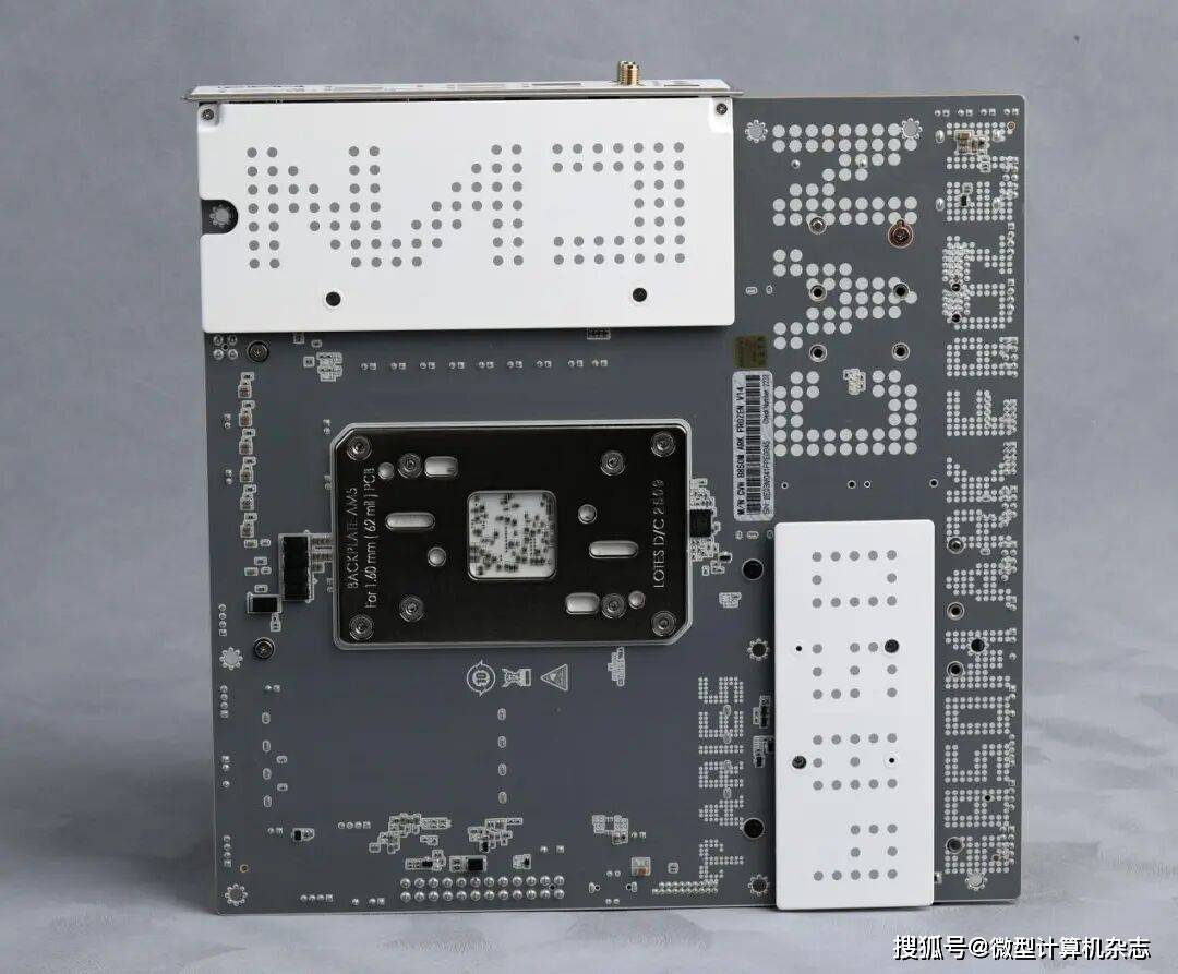 ▲主板背面配备星图保护背板,可以起到辅助供电电路散热、保护元器件的作用。同时主板背面也有大量点阵元素,不再是传统的纯色设计。