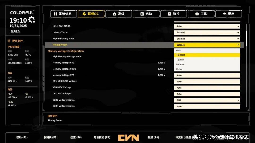 此外七彩虹在B850M ARK方舟主板的BIOS中,也加入了内存性能优化黑科技——Latency Turbo(降低延迟)与High Efficiency Mode(高效能模式)两个选项。开启这两个模式后可以进一步提升内存的传输带宽、降低延迟。需要说明的是High Efficiency Mode拥有“Relax”(宽松)“Balance”(平衡)“Tighter”(较紧)“Tightest”(最紧)4个选项,“Tightest”可以提供最好的性能,其他选项依次降低。需要注意的是,开启High Efficiency Mode后,BIOS会弹出可能有不稳定现象的警告出现,如果用户遇到这类情况,降低效能等级或关闭高效能模式即可。