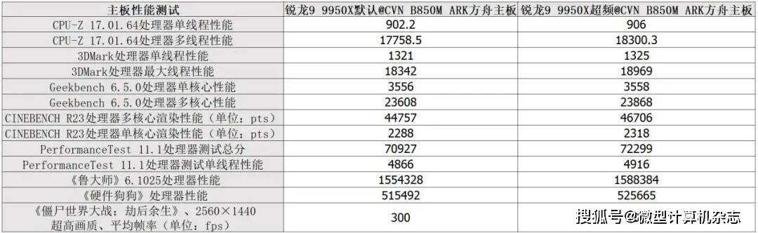 当B850M ARK方舟主板对锐龙9 9950X进行降压超频后,还可以带来明显的性能提升。超频后,锐龙9 9950X的CINEBENCH R23处理器多核心渲染测试成绩达到46706pts,较超频前提升4.4%。在PerformanceTest 11.1处理器测试中,超频后,锐龙9 9950X的处理器测试总分达到72299,单线程性能为4916,较超频前分别提升1.9%、1%。在《硬件狗狗》处理器性能测试中,超频前,锐龙9 9950X的测试成绩为515492,超频后其成绩达到525665,提升2%,可以击败全国99%的用户,因此得到了“会当凌绝顶,一览众山小”的优秀评价。在《鲁大师》6.1025处理器性能测试中,超频后,锐龙9 9950X的处理器性能突破158万分大关,较超频前提升2.2%,帮助我们的整机性能可以轻松击败全国99.6087%的全国用户。综合以上测试来看,B850M ARK方舟主板可以轻松释放出锐龙9 9950X的默认性能与超频能力。