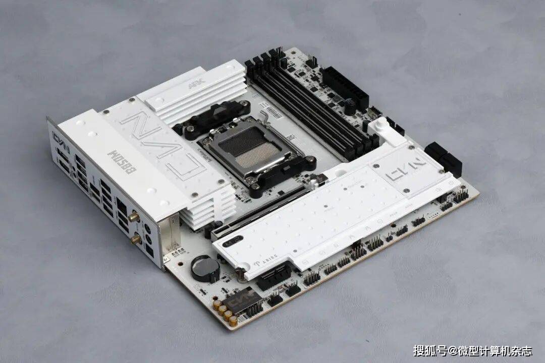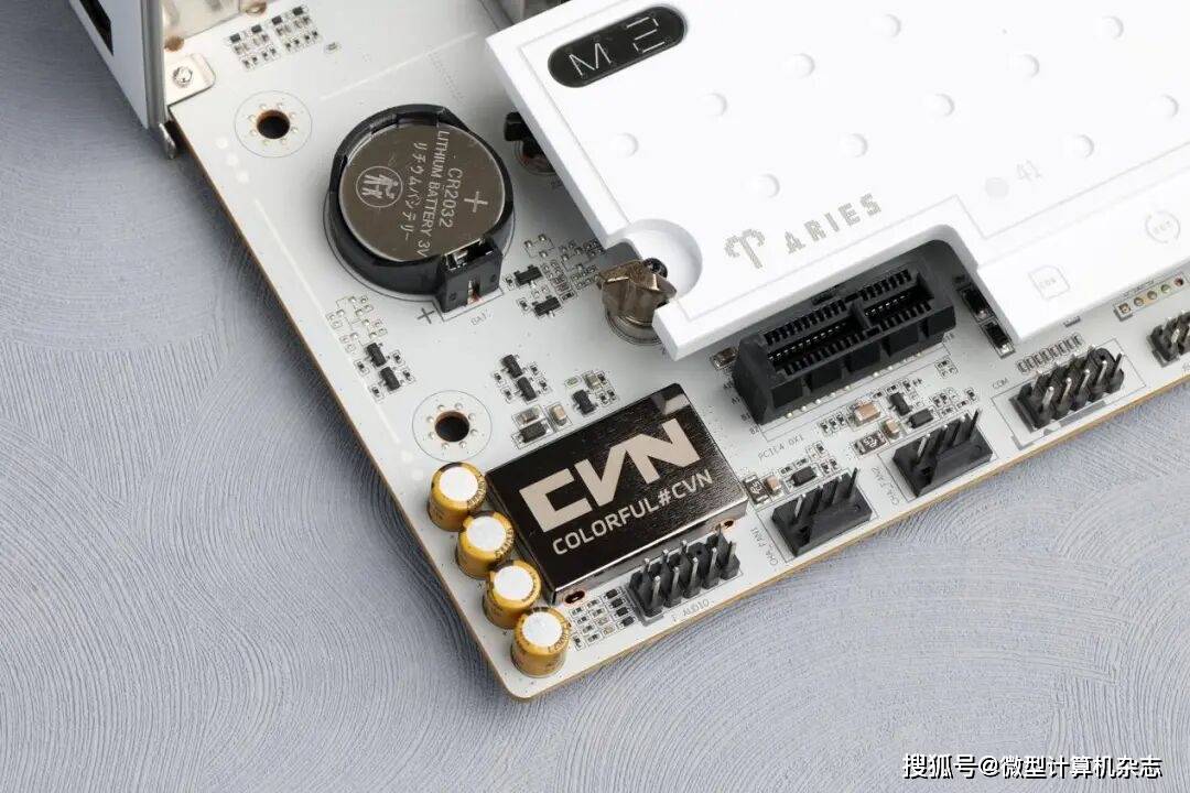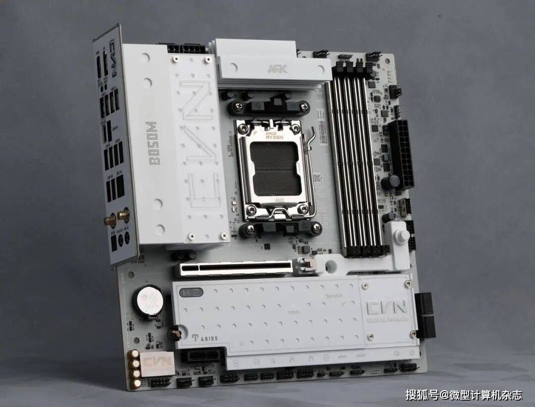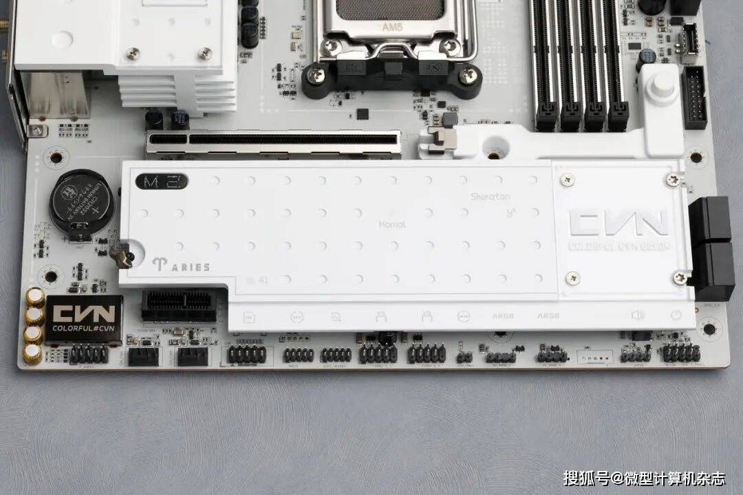目前面向普通消费者的七彩虹主板主要以定位中端的战斧系列、定位中高端的CVN系列与定位旗舰的iGAME系列组成。其中CVN系列主板以科幻场景中的星际战舰概念为设计核心,而星舰又多以白色、银灰色涂装,因此CVN系列主板也主要采用这两种颜色配色。为提升散热性能,这款B850M ARK方舟主板配备通过激光雕刻与CNC精工切割工艺打造,拥有复合沟槽设计的新一代寒霜装甲,搭配细腻喷漆工艺,呈现出简约而不失大气的纯白风格。装甲上融入的点阵风格设计与星图元素让主板看上去更加生动、活泼,而且还能增加装甲的散热面积。此外,七彩虹在主板供电散热以及芯片组散热装甲上搭载了两块星图铭板,不仅让主板看上去拥有更多的CVN元素,更有辨识度,而且用户还可更换、安装自己更喜欢的铭板,打造独一无二的个性化主机。值得一提的是,主板背面配备了星图保护背板,可以起到辅助供电电路散热、保护元器件的作用。