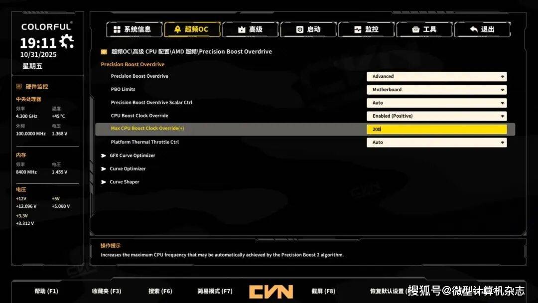 ▲点击BIOS首页右下角的精准增压超频模式就能打开PBO,非常方便。