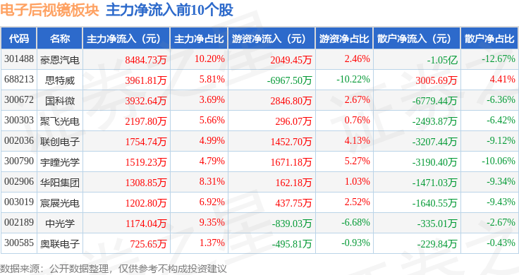 从资金流向上来看,当日电子后视镜板块主力资金净流出11.45亿元,游资资金净流入4.76亿元,散户资金净流入6.69亿元。电子后视镜板块个股资金流向见下表: