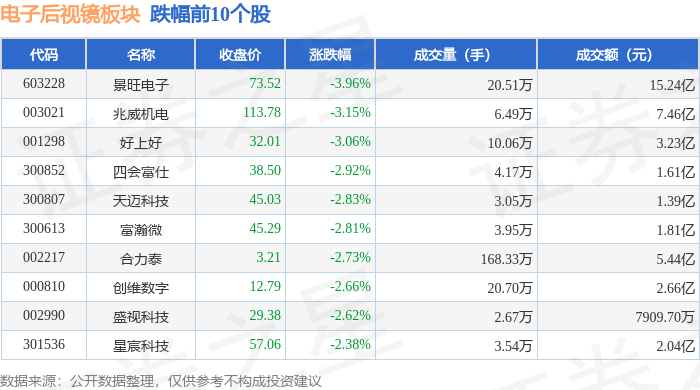 证券之星消息,11月7日电子后视镜板块较上一交易日下跌1.34%,景旺电子领跌。当日上证指数报收于3997.56,下跌0.25%。深证成指报收于13404.06,下跌0.36%。电子后视镜板块个股涨跌见下表: