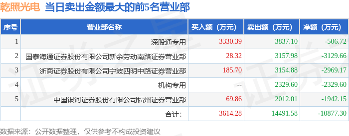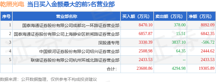 从龙虎榜公布的当日买卖数据来看,机构合计净卖出2329.6万元,北向资金合计净卖出506.72万元。上海超短帮、流沙河等知名游资榜上有名。(知名游资上海超短帮一般指国泰海通证券股份有限公司上海静安区新闸路证券营业部席位、知名游资流沙河一般指中国银河证券股份有限公司绍兴证券营业部席位,根据市场资料整理,仅供参考)