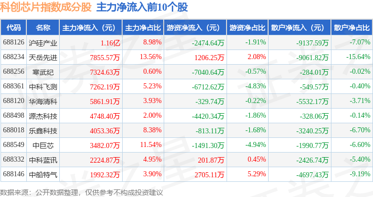 资金流向方面,科创芯片(000685)指数成份股当日主力资金净流出合计32.09亿元,游资资金净流入合计20.77亿元,散户资金净流入合计11.32亿元。成份股资金流向详情见下表: