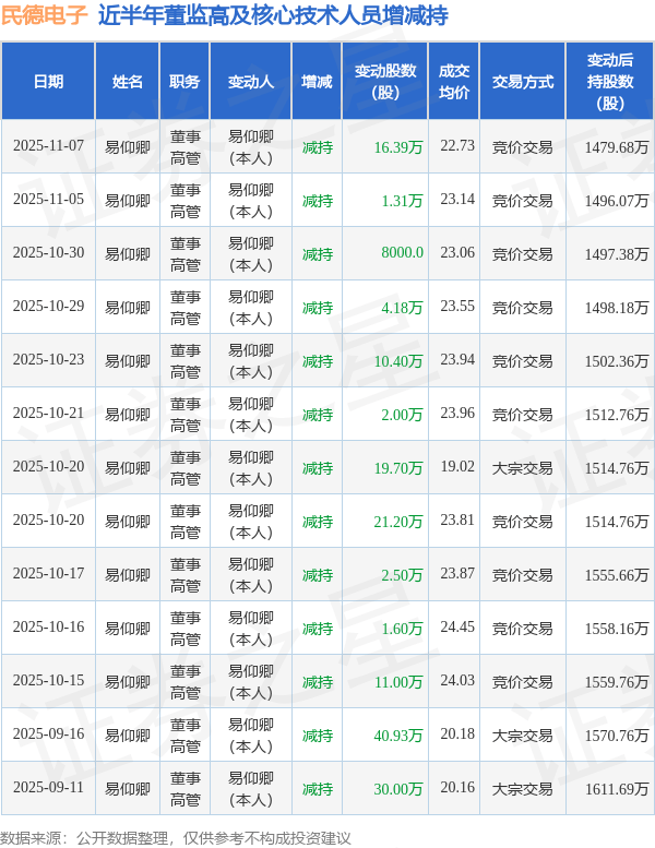 民德电子近半年内的董监高及核心技术人员增减持详情如下: