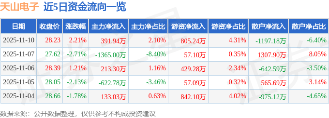 证券之星消息,截至2025年11月10日收盘,天山电子(301379)报收于28.23元,上涨2.21%,换手率5.24%,成交量6.67万手,成交额1.87亿元。