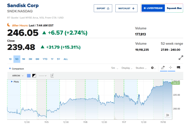 由于人工智能带来的需求,存储芯片制造商闪迪(SanDisk)9月季度业绩超出市场预期,该公司也上调了12月季度的业绩目标。闪迪股价随之高涨。11月10日盘前持续走高,有望冲击250美元的历史新高。