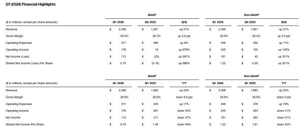 闪迪在当地时间11月6日公布截至10月3日的2025财年第一季度业绩报告,经调整后每股收益为1.22 美元,营收达23.1亿美元。此前分析师预期该季度每股收益为0.88美元,营收21.5亿美元。