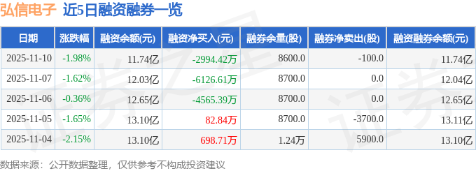 证券之星消息,截至2025年11月10日收盘,弘信电子(300657)报收于29.2元,下跌1.98%,换手率3.6%,成交量16.98万手,成交额4.97亿元。