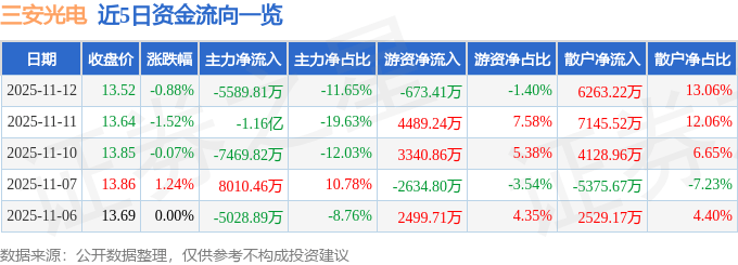 证券之星消息,截至2025年11月12日收盘,三安光电(600703)报收于13.52元,下跌0.88%,换手率0.71%,成交量35.46万手,成交额4.8亿元。