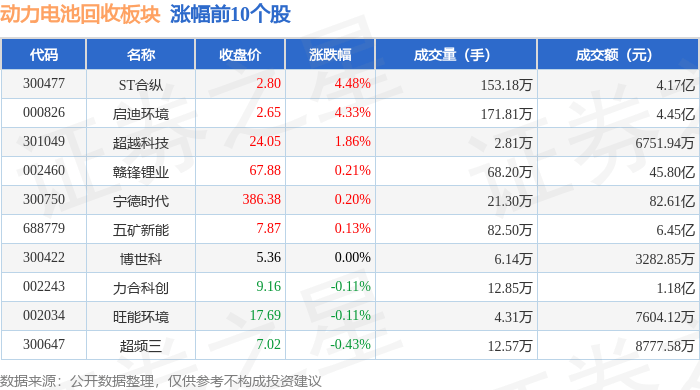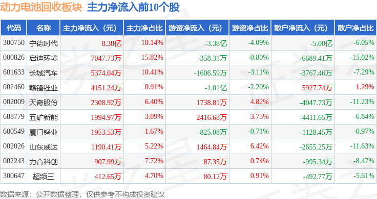 从资金流向上来看,当日动力电池回收板块主力资金净流出24.44亿元,游资资金净流入2.28亿元,散户资金净流入22.16亿元。动力电池回收板块个股资金流向见下表: