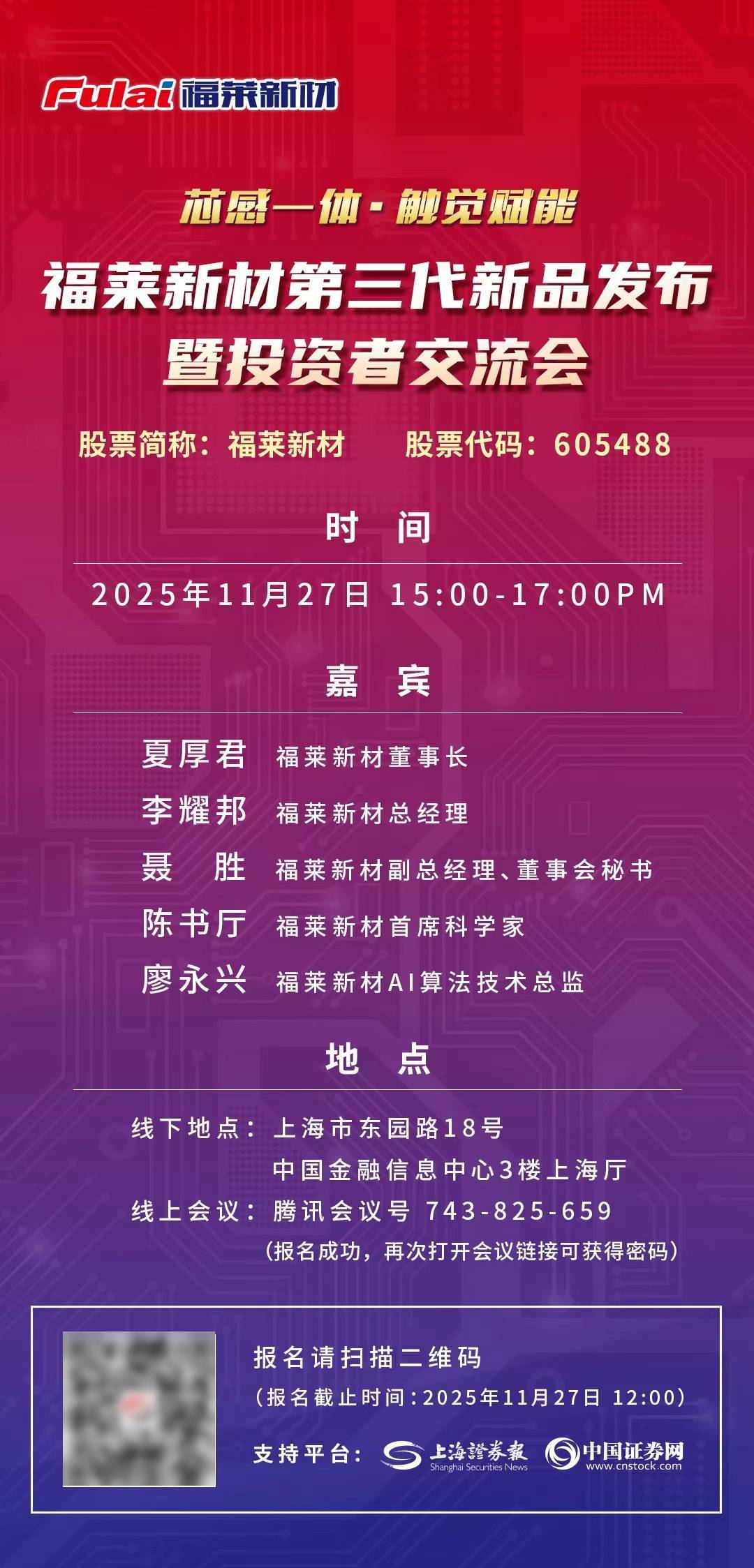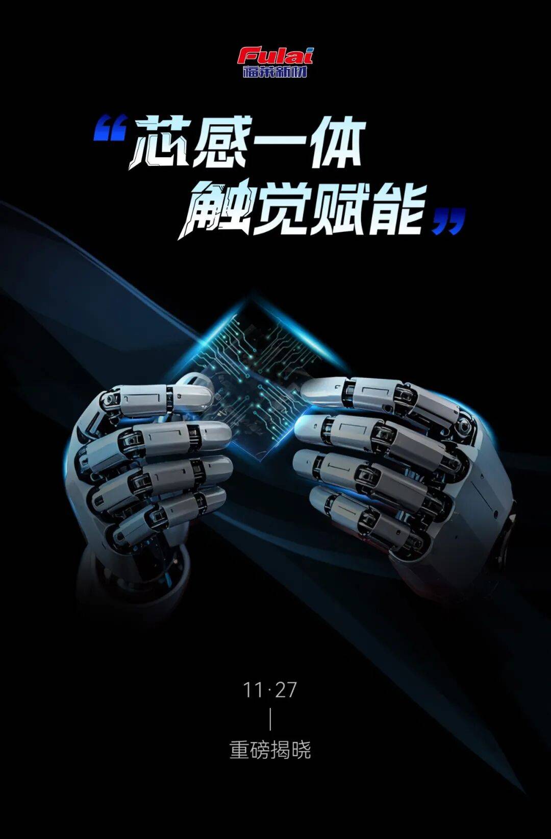 11月12日,福莱新材旗下账号“福莱柔性传感”发布新品预告,主题为“芯感一体,触觉赋能”,海报主体为一款植入芯片的电子皮肤,新品发布时间是11月27日。
