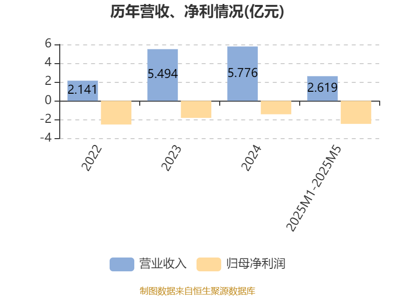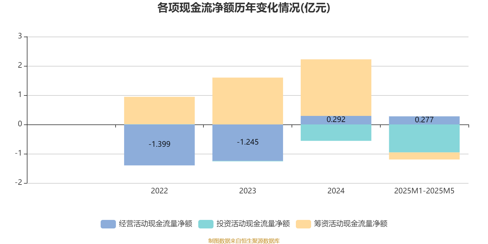 2025年1月至5月,公司经营活动现金流净额为2767.2万元,同比增长184.69%;筹资活动现金流净额-2416.5万元,同比减少4389.8万元;投资活动现金流净额-9552.2万元,上年同期为-2338.7万元。