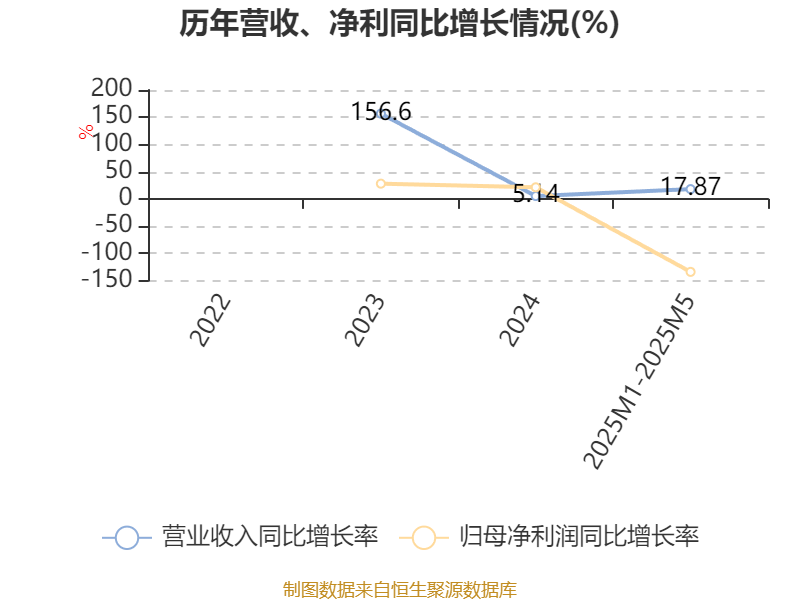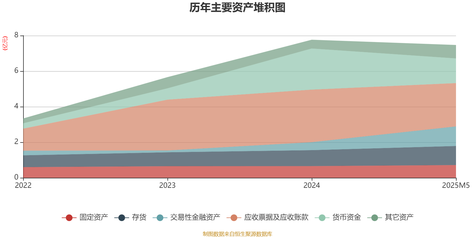 资产重大变化方面,截至2025年5月,公司货币资金较上期末减少39.96%,占公司总资产比重下降11.21个百分点;交易性金融资产较上期末增加144.2%,占公司总资产比重上升8.93个百分点;应收票据及应收账款较上期末减少17.58%,占公司总资产比重下降5.46个百分点;存货较上期末增加20.06%,占公司总资产比重上升2.85个百分点。