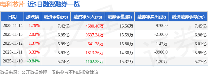 电科芯片融资融券信息显示,融资方面,当日融资买入9861.11万元,融资偿还5180.71万元,融资净买入4680.4万元,连续3日净买入累计1.5亿元。融券方面,融券卖出1.08万股,融券偿还1100.0股,融券余量16.56万股,融券余额254.36万元。融资融券余额7.45亿元。