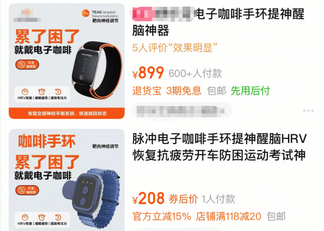 有网友发现,在电商平台上出现了多款电子咖啡手环,宣称能替代咖啡、实现“物理提神”,并能通过微电流技术缓解疲劳、促进运动恢复、甚至提升注意力。