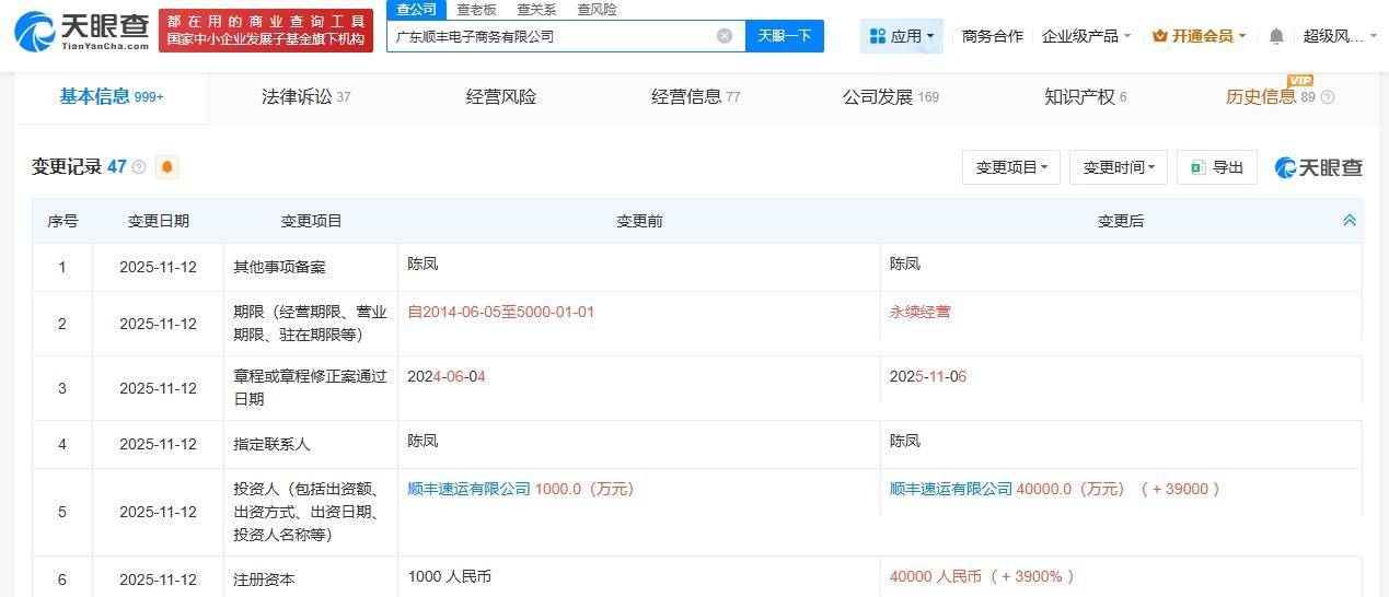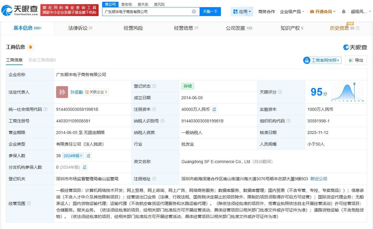每经AI快讯,天眼查App显示,近日,广东顺丰电子商务有限公司发生工商变更,注册资本由1000万元人民币增至4亿元人民币,增幅3900%。该公司成立于2014年6月,法定代表人为孙坚勤,经营范围包括计算机网络技术开发、国内贸易、国际货运代理业务、国内货物运输代理等。股东信息显示,该公司由顺丰速运有限公司全资持股。