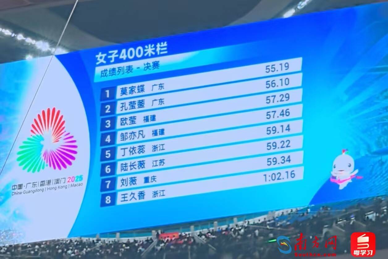 11月17日晚,十五运会女子400米栏决赛在广东奥体中心举行。最终,广东队莫家蝶以55秒19的成绩夺得金牌,其队友孔莹蓥以56秒10的成绩夺得银牌,福建选手欧莹则以57秒29的成绩夺得铜牌。