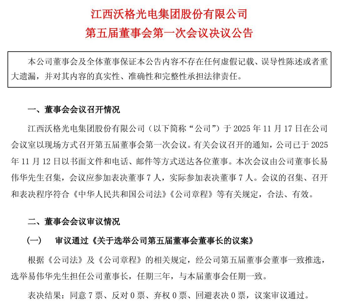 11月17日晚间沃格光电发布公告称,公司第五届第一次董事会会议于2025年11月17日在公司会议室以现场方式召开。会议审议了《关于选举公司第五届董事会董事长的议案》、审议通过《关于选举公司第五届董事会专门委员会委员及主任委员的议案》、审议通过《关于聘任公司总经理的议案》等文件。