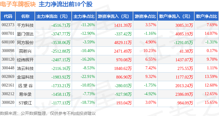 从资金流向上来看,当日电子车牌板块主力资金净流出2.81亿元,游资资金净流入1.38亿元,散户资金净流入1.43亿元。电子车牌板块个股资金流向见下表: