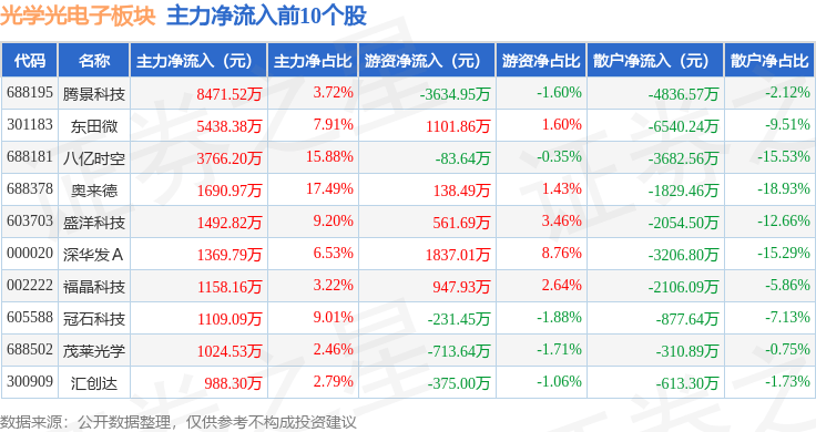 从资金流向上来看,当日光学光电子板块主力资金净流出12.31亿元,游资资金净流入1.94亿元,散户资金净流入10.37亿元。光学光电子板块个股资金流向见下表: