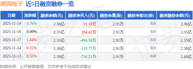 得润电子融资融券信息显示,融资方面,当日融资买入946.04万元,融资偿还914.86万元,融资净买入31.18万元。融券方面,融券卖出0.0股,融券偿还0.0股,融券余量2.91万股,融券余额20.86万元。融资融券余额2.36亿元。