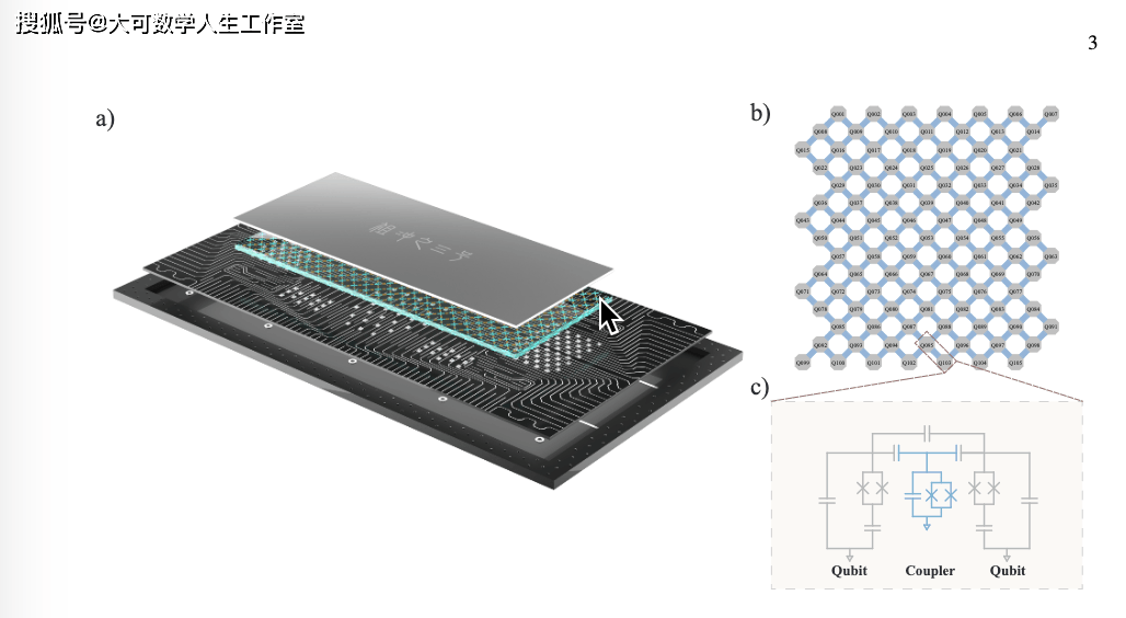 图|祖冲之 3.0 量子处理器。a) 祖冲之 3.0 量子处理器的示意图。该器件由两块采用倒装芯片技术集成的蓝宝石芯片组成。一块芯片集成了 105 个量子比特和 182 个耦合器,另一块芯片集成了所有控制线和读出谐振器。b) 量子比特和耦合器的拓扑图。深灰色表示量子比特,浅蓝色表示耦合器。c) 通过耦合器耦合的两个量子比特的简化电路原理图。(来源:arXiv)